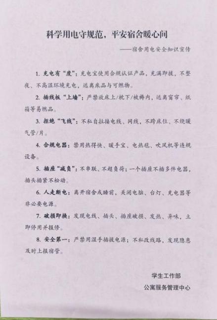 聚焦用电安全 护航宿舍平安 —— 学生工作部联合安全保卫处开展学生公寓安全专项检查 为切实筑牢学生住宿安全防线,压实校园安全管理责任,11月25日晚间,校党委委员、副校长张建林亲自带队,学生工作部与安全保卫处联动,在青山校区、九原校区同步开展学生公寓安全用电专项检查行动,通过隐患排查与安全宣传相结合的形式,精准清除安全隐患,开展学生安全教育。 此次专项检查严格遵循“全覆盖、无死角、重实效”原则,检查团队分组逐楼逐寝推进工作:一方面细致核查大功率违禁电器使用、私拉乱接电线等违规行为,对排查出的安全隐患当场制止并指导整改,确保问题“即时清零”;另一方面向学生发放《宿舍用电安全知识》宣传单页,重点宣讲冬季用电防火要点、合规使用电器等知识,强化学生安全防范意识。警务室民警同志同步参与检查,开展反诈知识普及与管制刀具排查等工作。 本次宿舍安全检查提前发现并整改违规用电等潜在风险,强化了学生安全意识,让“防患未然”理念深入人心。作为宿舍安全管理的长项工作,下一步学生工作部公寓服务管理中心将持续加大监管力度,常态化开展排查教育,完善长效机制,全力守护学生公寓安全稳定,为学生营造安全和谐的住宿环境。(学生工作部)