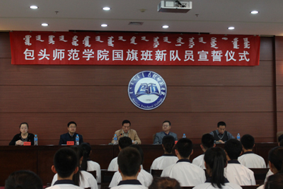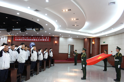 11月26日下午,我校国旗班举行了2015级新队员入队宣誓仪式。学生工作部(武装部)部长尚海涛、副部长蒋永祎、副部长郭志峰、学生工作部赵雪晶老师出席了仪式,56名新队员及部分老队员参加了宣誓仪式,仪式由国旗班班主任李胜强主持。